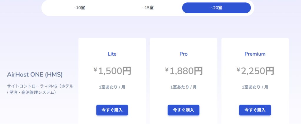 ただし、部屋数が一定以上大きくなると、部屋あたりの料金は抑えられます(例:~20室ならLiteプランで1,500円/部屋)