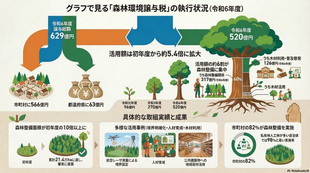令和6年度における森林環境譲与税の譲与総額は、なんと629億円(実際に使用された額「活用額」は520億)にものぼります。