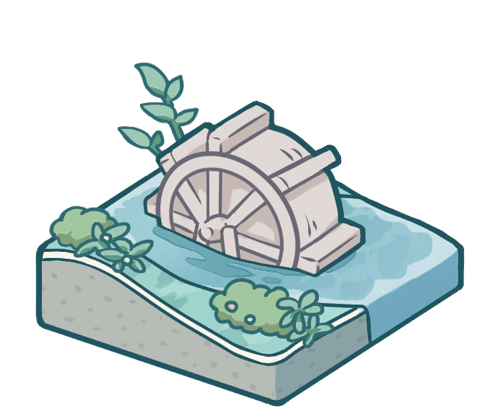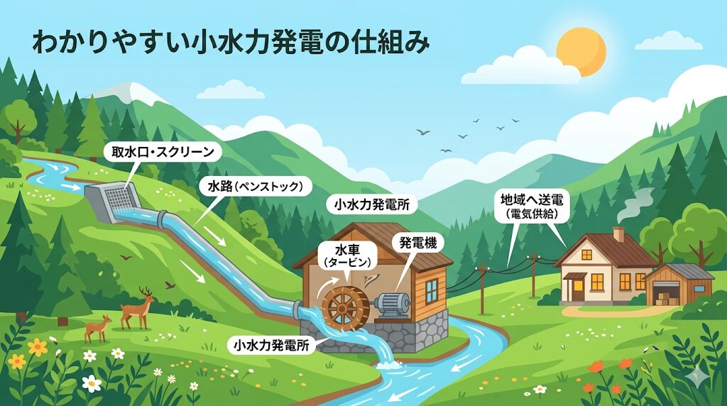 - 河川や水路の「流量(水の量)」と「落差(高さ)」を利用してタービンを回し、発電します。